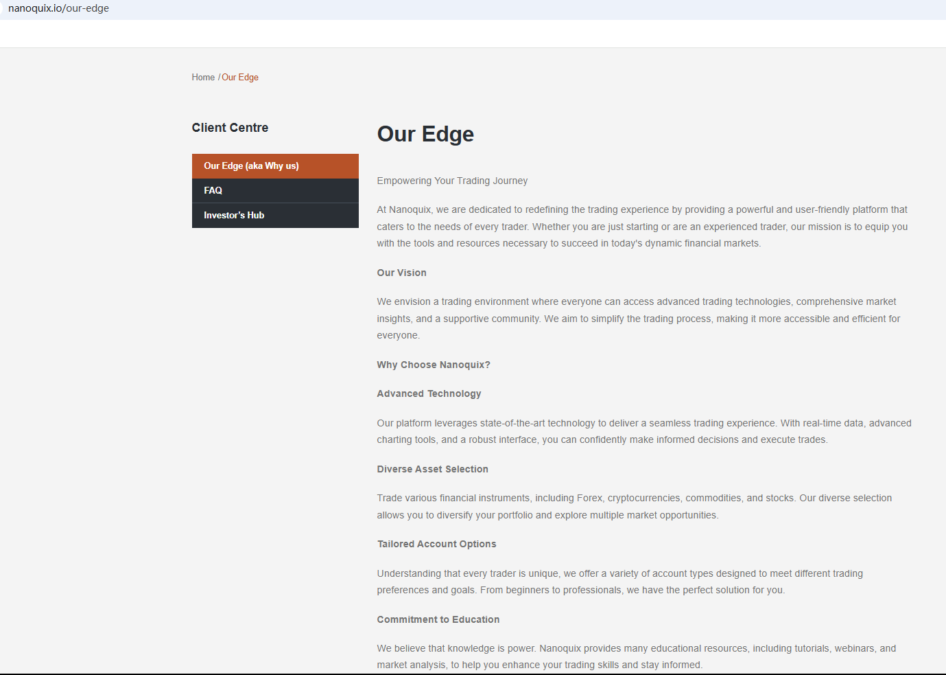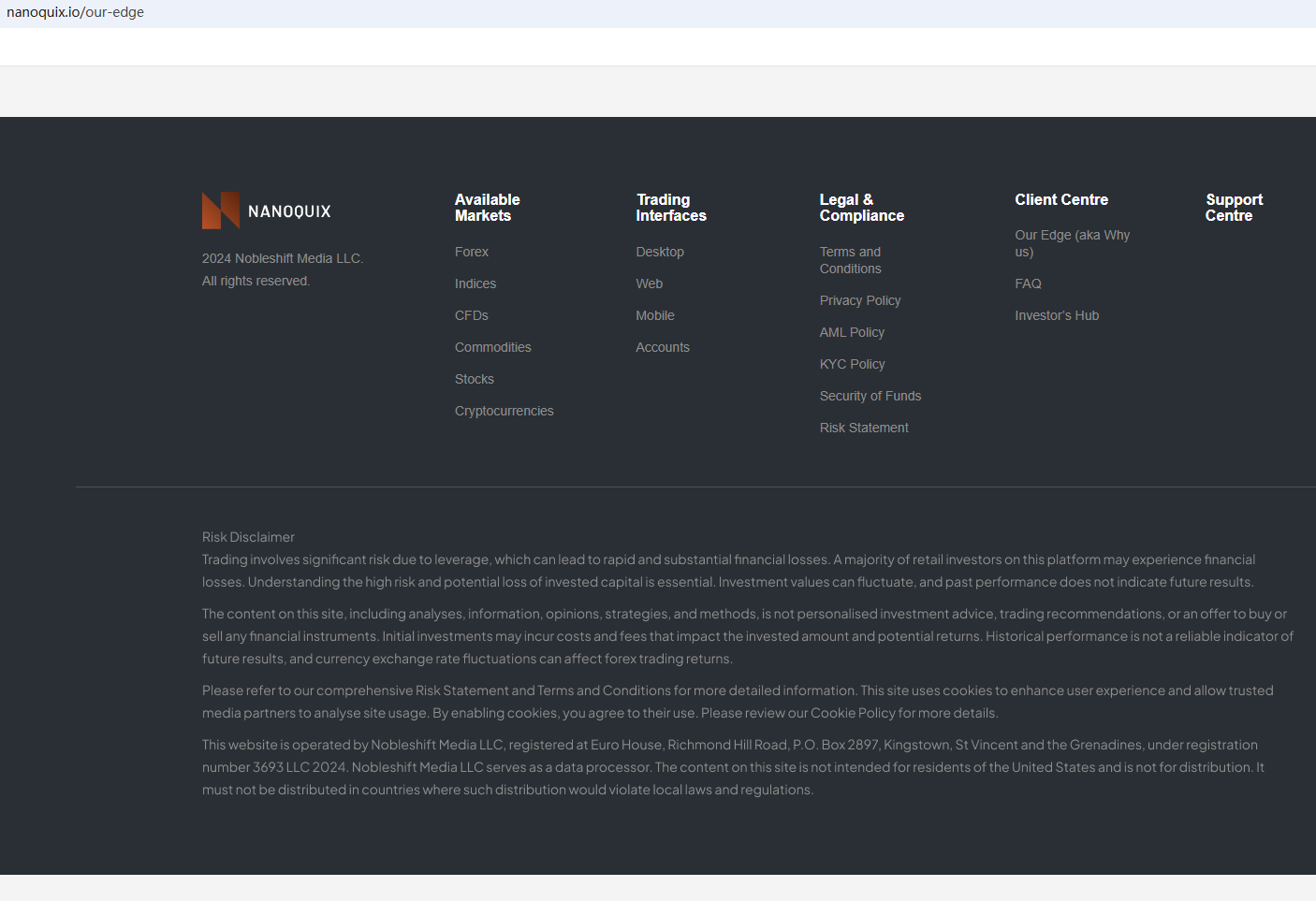 According to its website, it claims at the bottom of the website that it is affiliated with Nobleshift Media LLC and claims that Nobleshift Media LLC is regulated by the Financial Services Authority (SVG FSA). However, after careful investigation, we found that Nobleshift Media LLC is not a foreign exchange company, and there is no evidence that Nanoquix is related to Nobleshift Media LLC. It is just Nanoquix's one-sided statement. Investors should stay away from it.