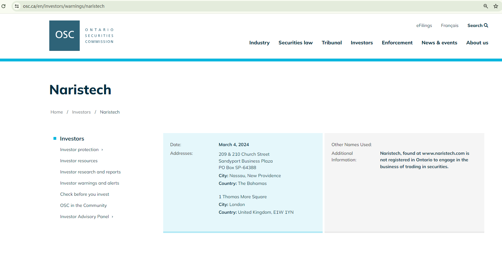 On March 4, 2024, the Ontario Securities Commission (OSC) issued a warning against Naristech, stating that this broker is not registered in Ontario to engage in the business of trading in securities. https://www.osc.ca/en/investors/warnings/naristech