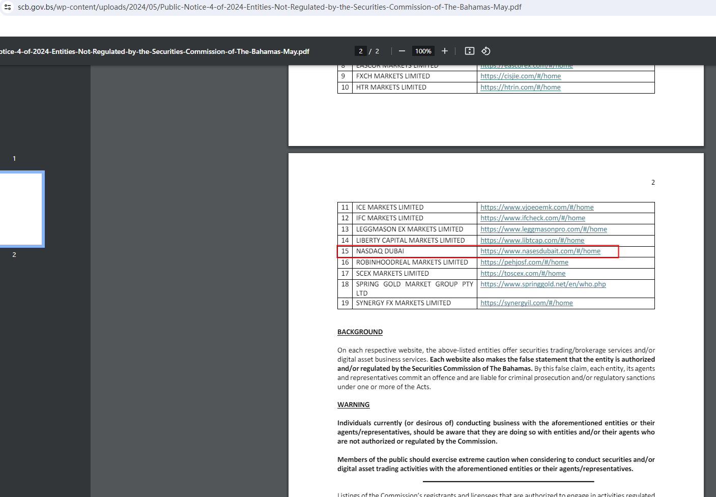 On May 1, 2024, the Securities Commission of The Bahamas (SCB) added Nasdaq Dubai to warning list for offering financial services or products without their permission. https://www.scb.gov.bs/wp-content/uploads/2024/05/Public-Notice-4-of-2024-Entities-Not-Regulated-by-the-Securities-Commission-of-The-Bahamas-May.pdf