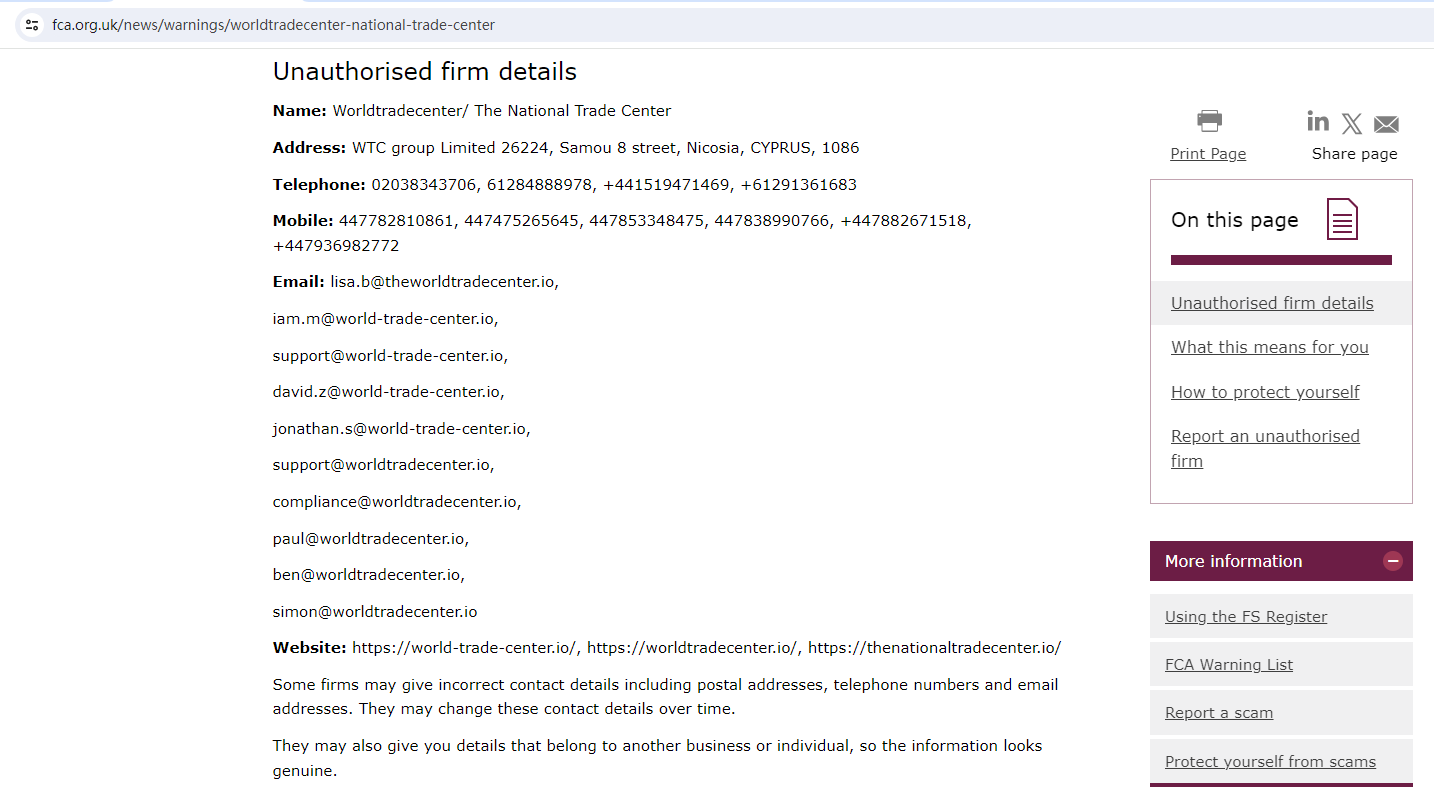 Since National Trade Center is still in business to steal money from unsuspecting investors, FCA updates its warning against the platform with more details about the unauthorized firm and cautions the public to stay away from it once again. You may visit: https://www.fca.org.uk/news/warnings/worldtradecenter-national-trade-center