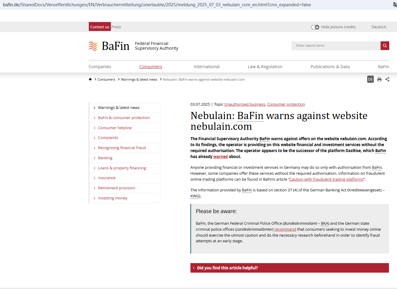 On July 11, 2025, the Federal Financial Supervisory Authority (BaFin) issued a warning against Nebulain for the lack of the required authorization. https://www.bafin.de/SharedDocs/Veroeffentlichungen/EN/Verbrauchermitteilung/unerlaubte/2025/meldung_2025_07_03_nebulain_com_en.html?cms_expanded=false