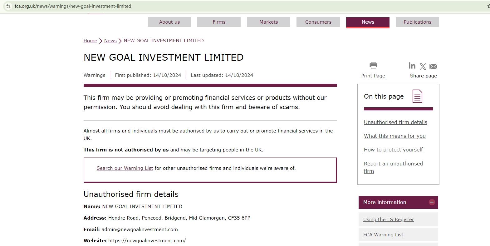 On October 14, 2024, the Financial Conduct Authority (FCA) issued a warning about New Goal Investment due to the lack of proper authorization. https://www.fca.org.uk/news/warnings/new-goal-investment-limited
