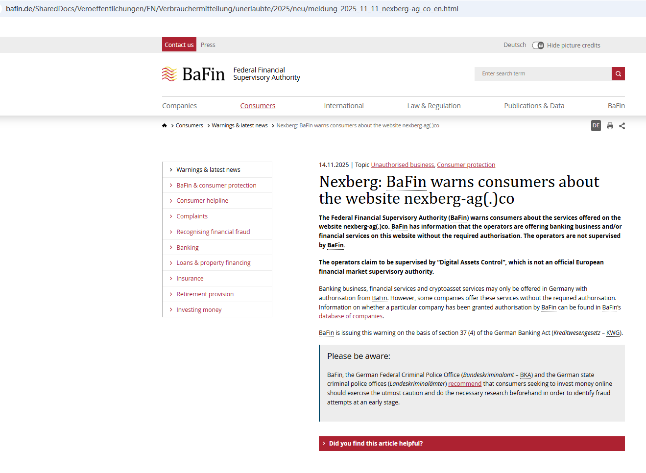 On November 14, 2025, the Federal Financial Supervisory Authority (BaFin) issued a warning against Nexberg for lacking the required authorization. https://www.bafin.de/SharedDocs/Veroeffentlichungen/EN/Verbrauchermitteilung/unerlaubte/2025/neu/meldung_2025_11_11_nexberg-ag_co_en.html