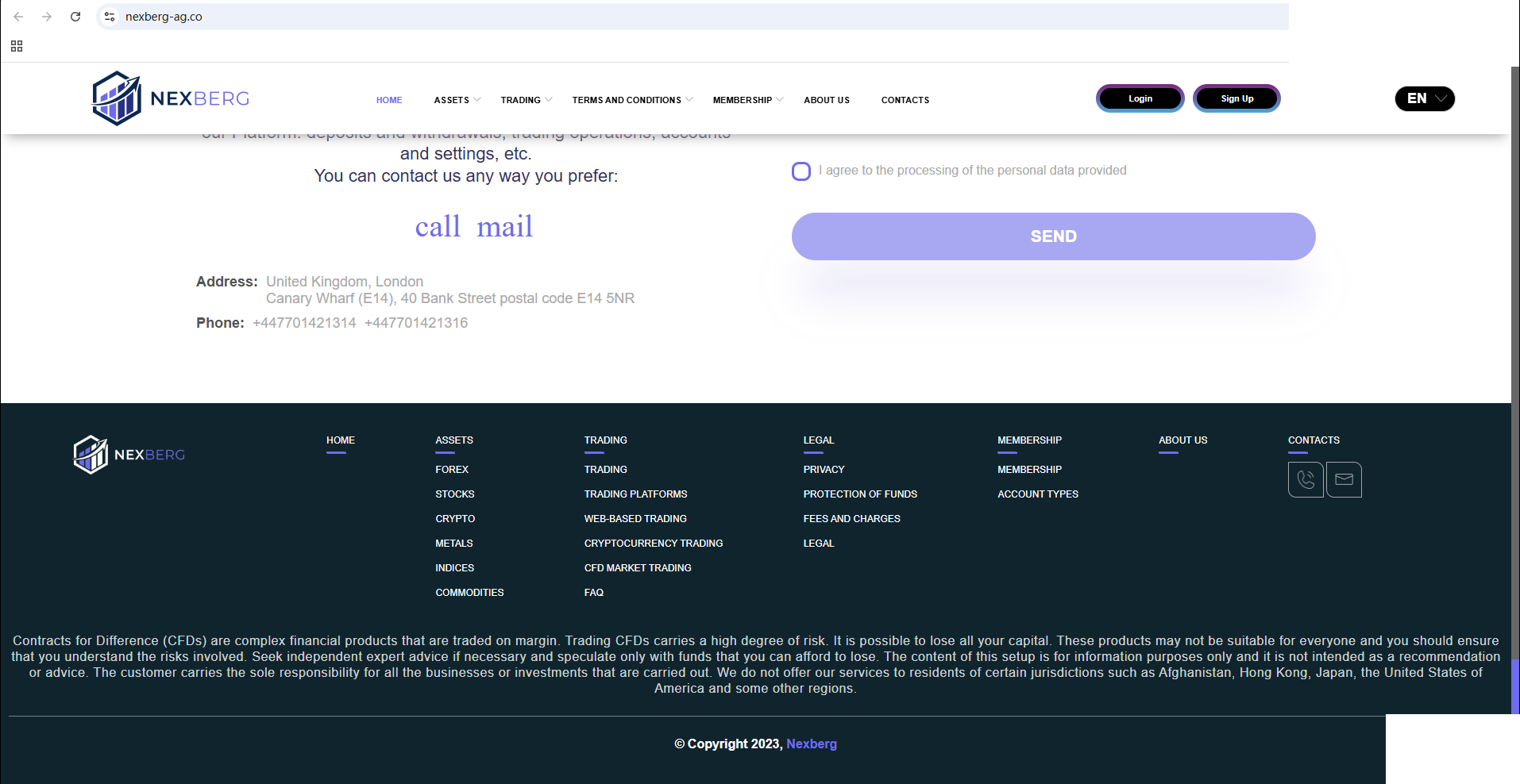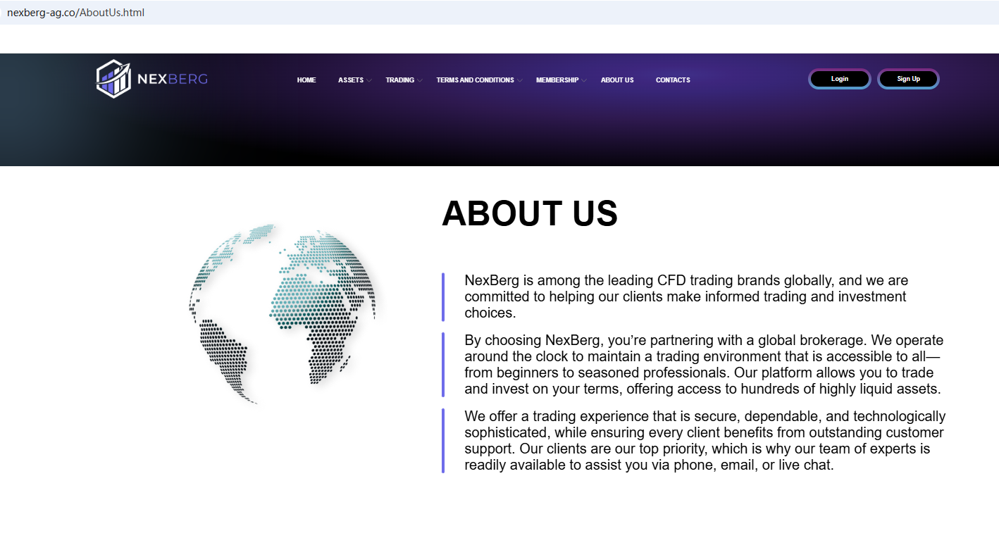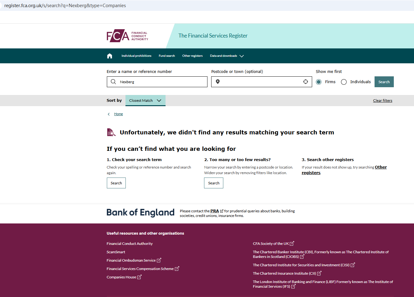 According to its website, it is located in the UK. Upon investigation, no matching information was found in the Financial Conduct Authority (FCA). In addition, the Federal Financial Supervisory Authority (BaFin) issued a warning against Nexberg for lacking the required authorization.