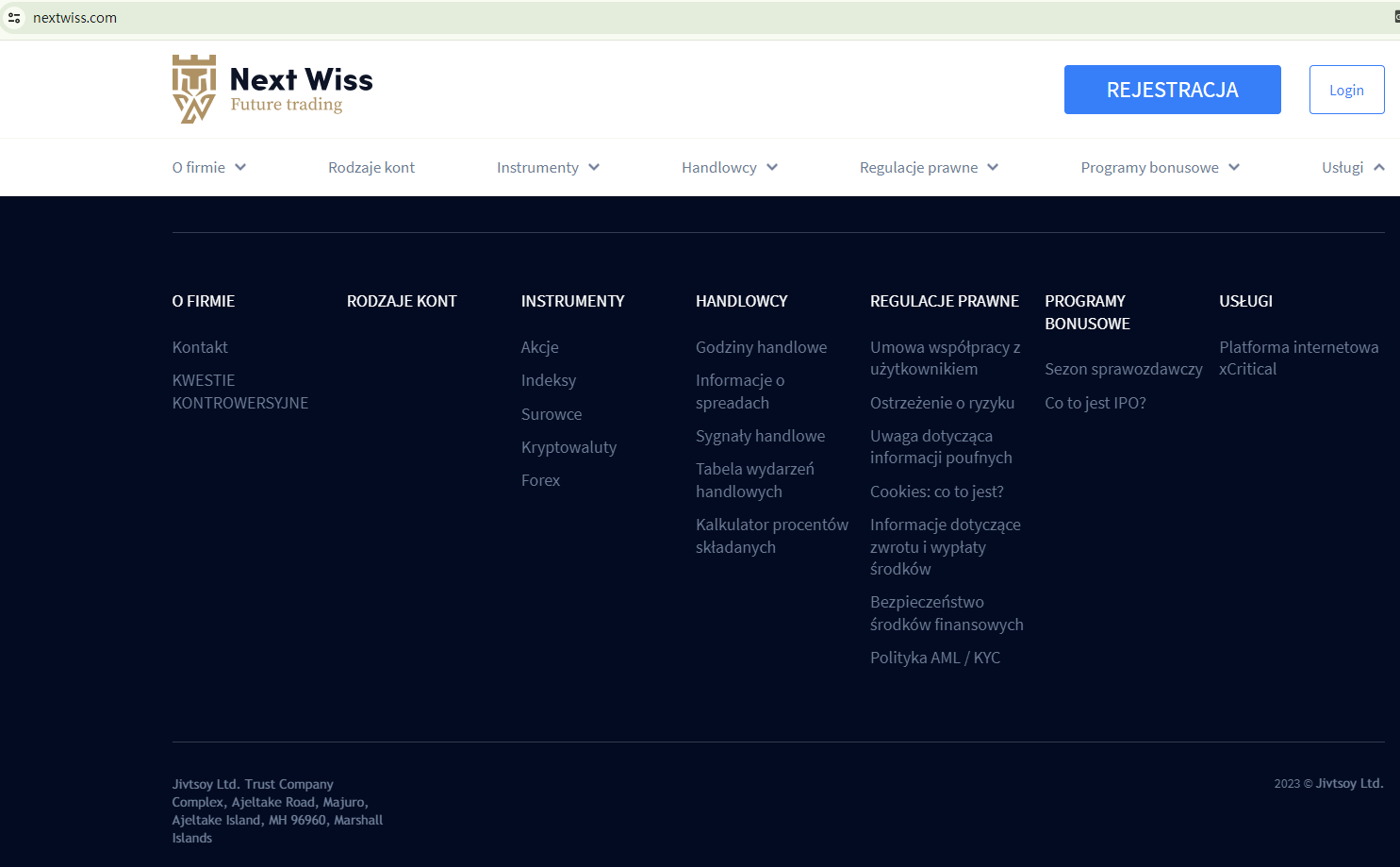 Next Wiss purports to be operated by Jivtsoy Ltd, a company registered with the Marshall Islands Registry (IRI), in an attempt to appear legitimate. However, it's important to note that the IRI is a privately held maritime and corporate registry service provider, not a regulatory body for forex trading activities. The absence of any information about Next Wiss' financial license is a significant red flag, as this could indicate potential fraudulent activity. Simply being registered with the IRI does not equate to having authorization from a relevant financial regulator.
