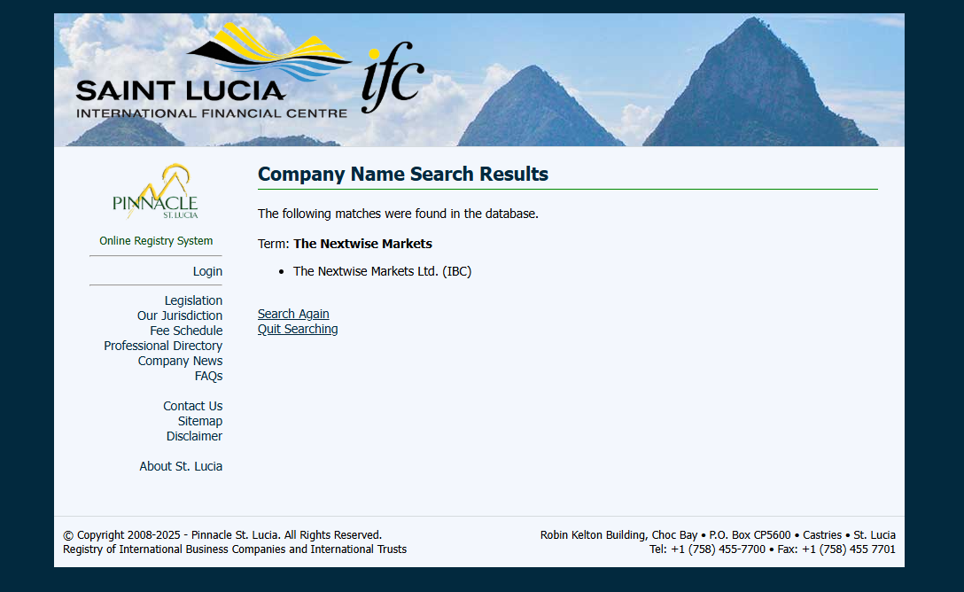Nextwise Markets claims to operate under the name The Nextwise Markets Ltd., registered in Saint Lucia, with an additional office in Mauritius. While this entity is listed in the Saint Lucia International Financial Centre (IFC) registry, this registration only confers International Business Company (IBC) status, which does not constitute a legitimate financial services license.