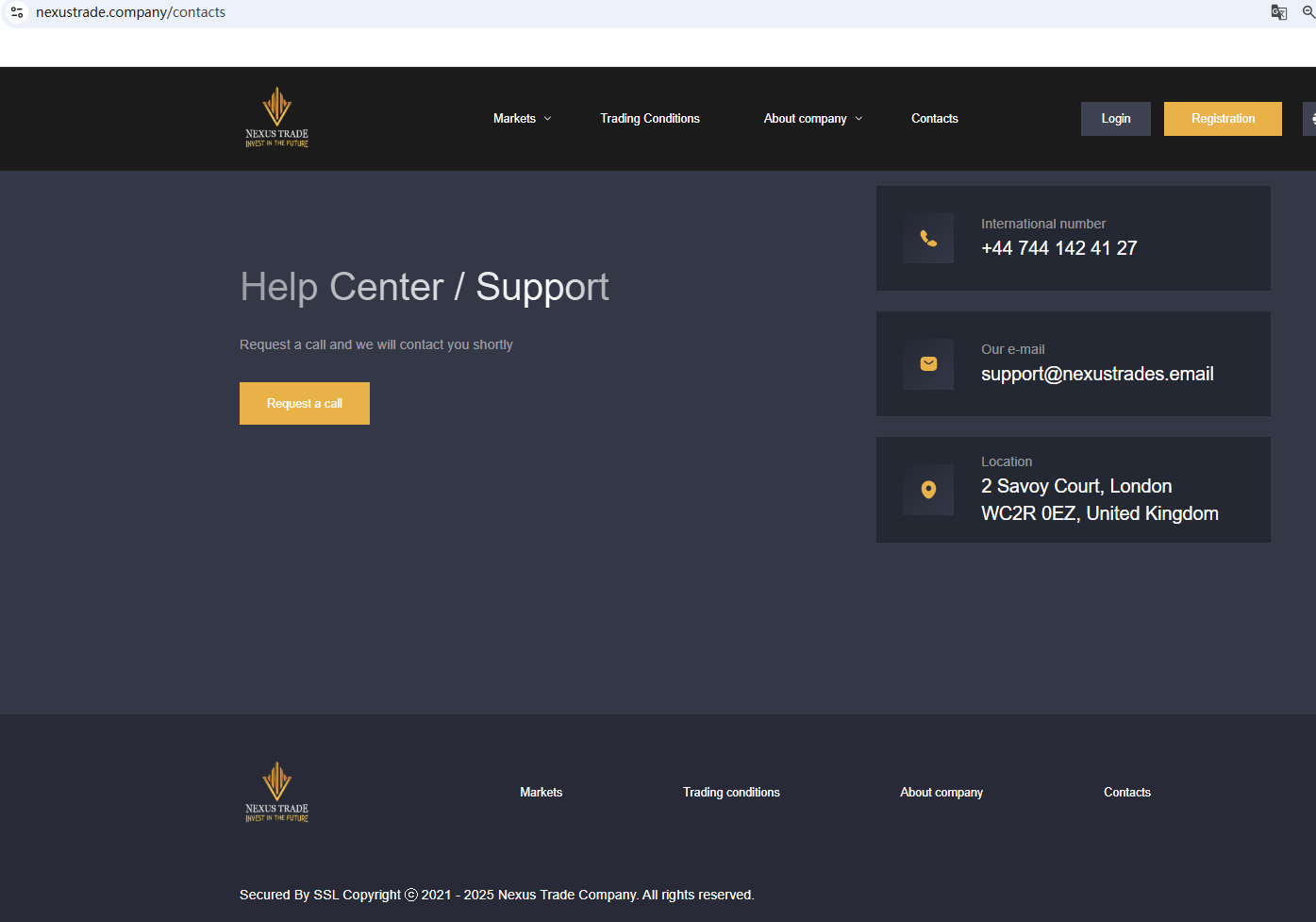 According to its website, it is located in the UK. Upon investigation, no matching information was found in the Financial Conduct Authority (FCA). In addition, the Financial Services and Markets Authority (FSMA) issued a warning about Nexus Trade Company for the lack of the required authorization.