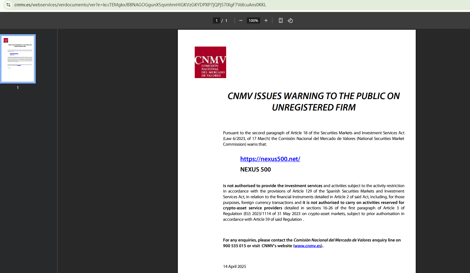 On April 14, 2025, the Comisión Nacional del Mercado de Valores (CNMV) has added NEXUS500 to its warning list for providing investment services without authorization. https://www.cnmv.es/Portal/ResultadoBusqueda?tipo=1&nombre=NEXUS500