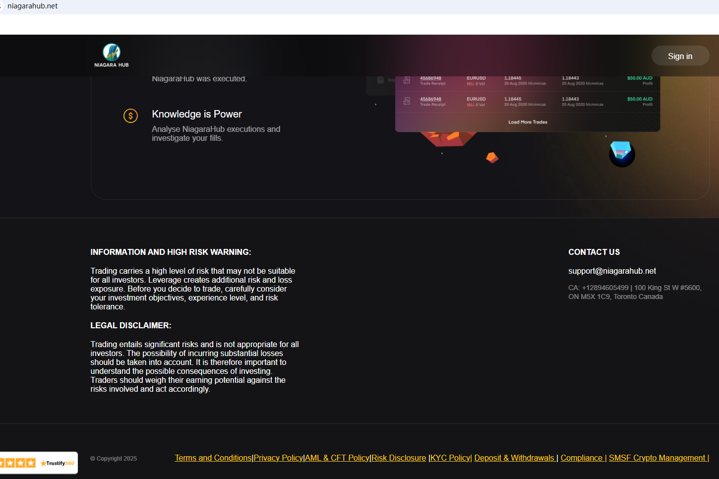 According to its website, it is located in Canada. Upon investigation, no matching information was found in the Investment Industry Regulatory Organization of Canada (IIROC). In addition, the British Columbia Securities Commission (BCSC) issued a warning against Clone Niagarahub.net, stating that this broker is not registered to trade in, or advise on, securities or derivatives in BC.