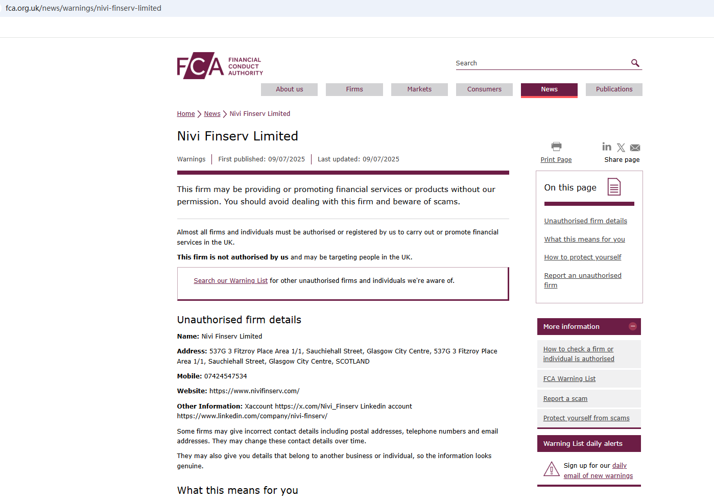 On July 9, 2025, the Financial Conduct Authority (FCA) issued a warning against Nivi Finserv Limited, believing this company might be providing financial services or products without proper authorization in the UK. https://www.fca.org.uk/news/warnings/nivi-finserv-limited