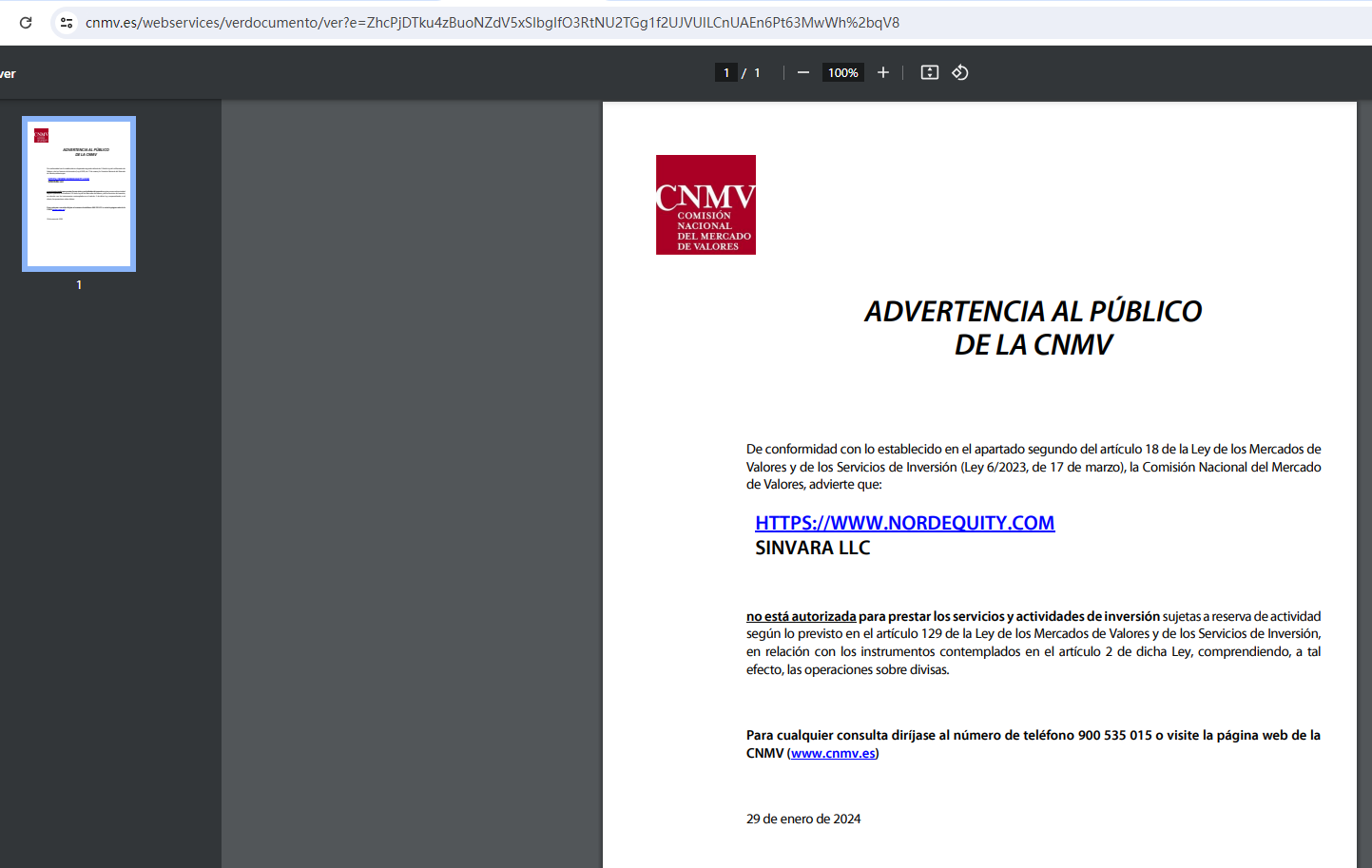 On 29 January 2024, the Comisión Nacional del Mercado de Valores (CNMV) issued a warning that NordEquity was providing financial services or products without authorisation. You may visit: https://www.cnmv.es/Portal/ResultadoBusqueda.aspx?tipo=1&sortExpression=Fecha&sortDirection=1&page=0