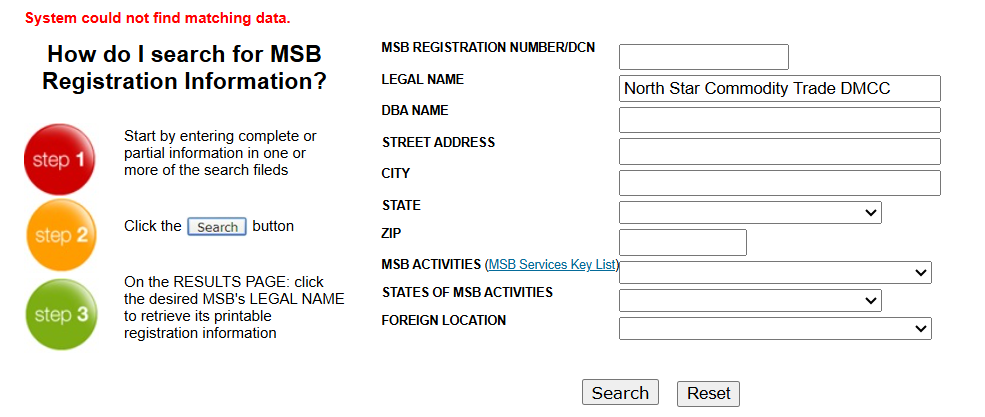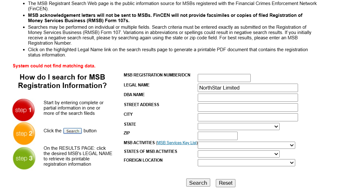 Furthermore, NorthStar asserts that it holds a Money Services Business (MSB) license from the U.S. Financial Crimes Enforcement Network (FinCEN). However, we were unable to verify this claim in FinCEN’s public database. More importantly, even if such an registration existed, FinCEN does not regulate forex brokers or provide investor protection, but solely focuses on anti-money laundering compliance.