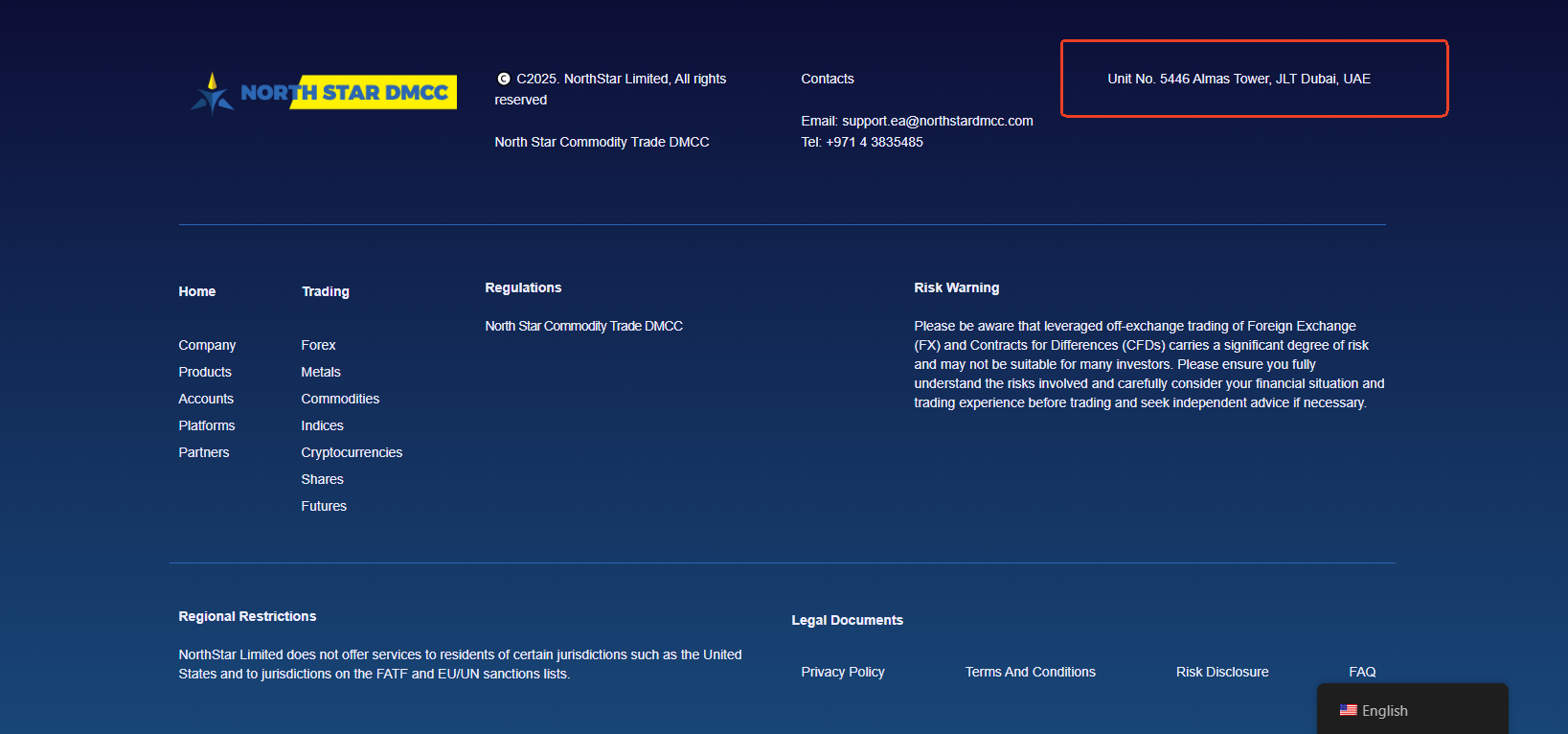NorthStar claims to be based in the UAE and states that it holds a certificate issued by the Dubai Multi Commodities Centre (DMCC) under the entity name North Star Commodity Trade. While we can confirm the existence of this license, it is critical to understand that DMCC is not a financial regulatory authority and does not oversee or license forex trading activities. In the UAE, the proper regulator for forex and securities is the Securities and Commodities Authority (SCA), yet our search of the SCA’s official register yielded no record of NorthStar or any affiliated entity.