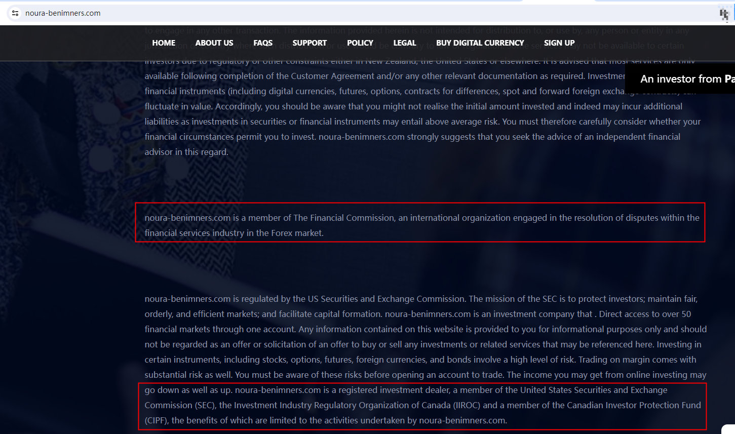 nourabenimners.com claims to be a member of the Investment Industry Regulatory Organization of Canada (IIROC) and a member of the Canadian Investor Protection Fund (CIPF), but the Canadian Investment Regulatory Organization (CIRO) issued a warning that nourabenimners.com falsely claims to be regulated by the former Investment Industry Regulatory Organization (IIROC) and a member of the Canadian Investor Protection Fund (CIPF).