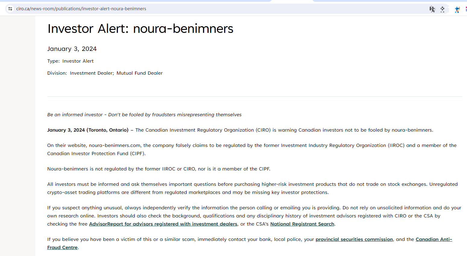 On 3 January 2024, the Canadian Investment Regulatory Organization (CIRO) is warning Canadian investors not to be fooled by noura-benimners. You may visit: https://www.ciro.ca/news-room/publications/investor-alert-noura-benimners