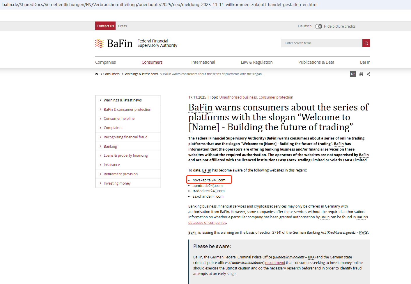 On November 17, 2025, the Federal Financial Supervisory Authority (BaFin) issued a warning against NovaKapital24 for lacking the required authorization. https://www.bafin.de/SharedDocs/Veroeffentlichungen/EN/Verbrauchermitteilung/unerlaubte/2025/neu/meldung_2025_11_11_willkommen_zukunft_handel_gestalten_en.html