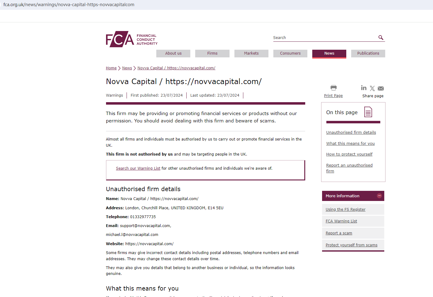 On July 23, 2024, the Financial Conduct Authority (FCA) issued a warning against Novva Capital, believing this company might be providing financial services or products without proper authorization in the UK. https://www.fca.org.uk/news/warnings/novva-capital-https-novvacapitalcom