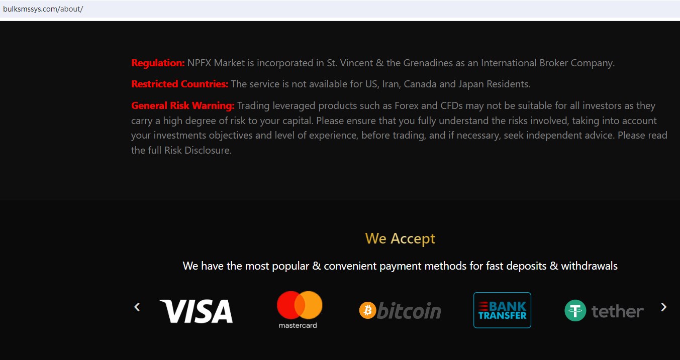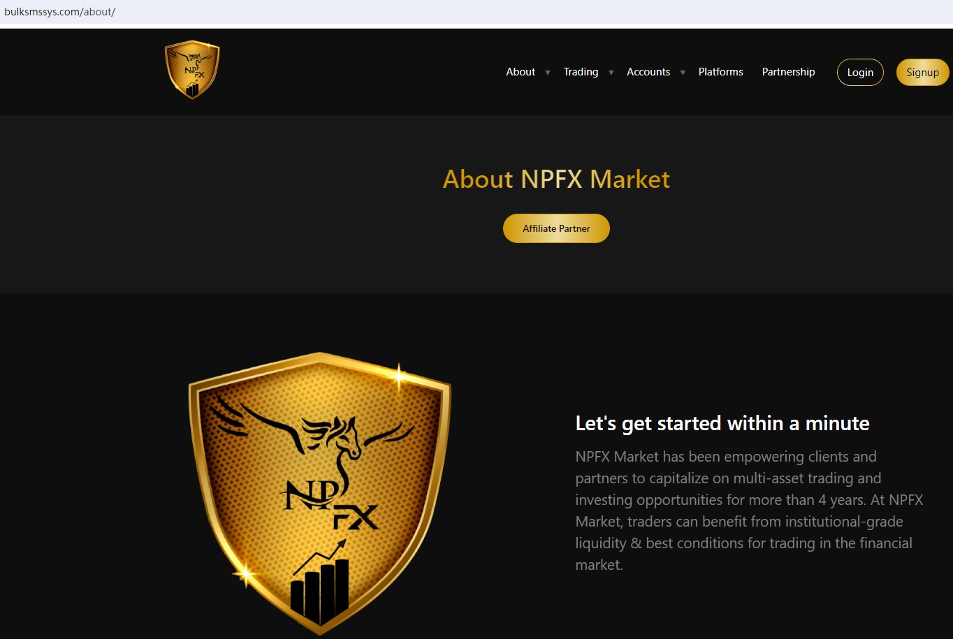 NPFX Market claims to be an international trading broker incorporated in St. Vincent & the Grenadines, offering wide range of financial services, including Forex, Stocks, Commodities, Cryptocurrencies, ETFs and more instruments in global markets.