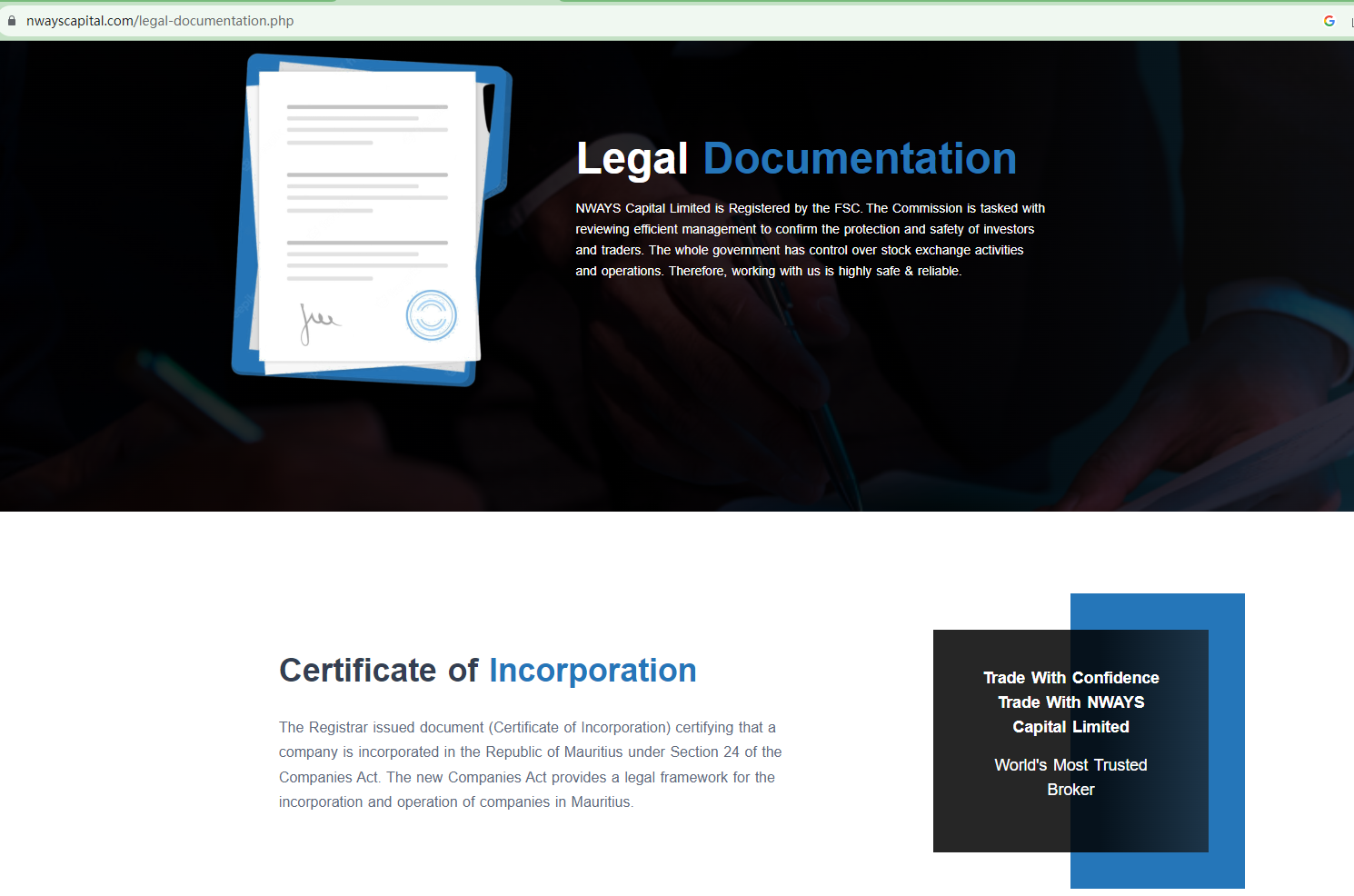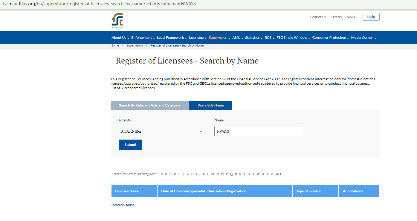 While NWAYS Capital portrays itself as a legal forex broker registered in Mauritius and with the Financial Services Commission (Mauritius FSC), we didn't find any record in the register of the Mauritius' financial regulator matching the company.