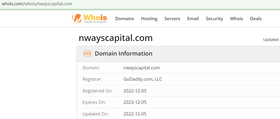 NWAYS Capital tries to convince unsuspecting investors that they are legitimate by giving vague statements about its regulatory status and company profiles. Its concealing certain crucial details of its company raises suspicions. NWAYS Capital's website doesn't provide legal documents, and the link to the Privacy Policy is dead. Despite claiming to have over two years of experience in business, its domain name ("nwayscapital.com") was first registered in December 2022. This inconsistency damages its credibility.