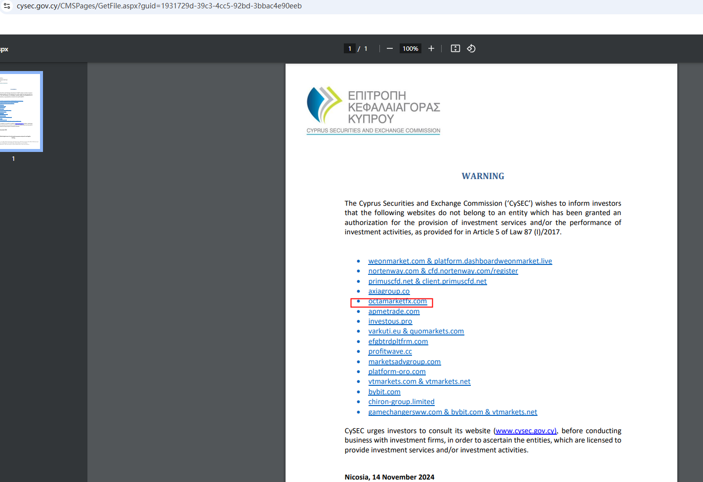 On Nov 14, 2024, the Cyprus Securities and Exchange Commission (CySEC) added Octa Market FX to its warning list, stating it does not belong to an entity which has been granted an authorization for the provision of investment services and/or the performance of investment activities. https://www.cysec.gov.cy/CMSPages/GetFile.aspx?guid=1931729d-39c3-4cc5-92bd-3bbac4e90eeb