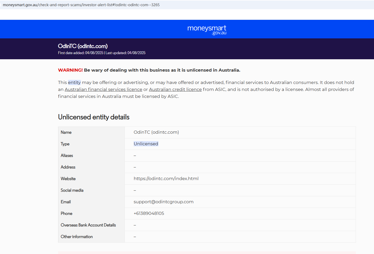 On Aug 1, 2025, the Australian Securities & Investments Commission (ASIC) issued a warning against OdinTC, believing this company might be providing financial services or products without proper authorization. https://moneysmart.gov.au/check-and-report-scams/investor-alert-list#!odintc-odintc-com--3265
