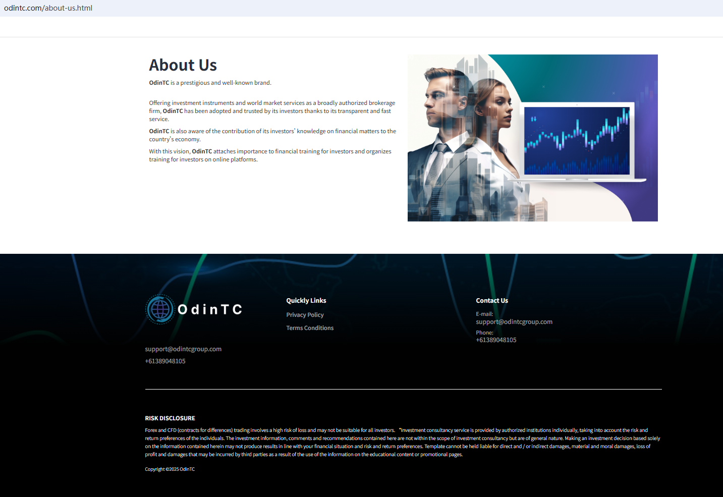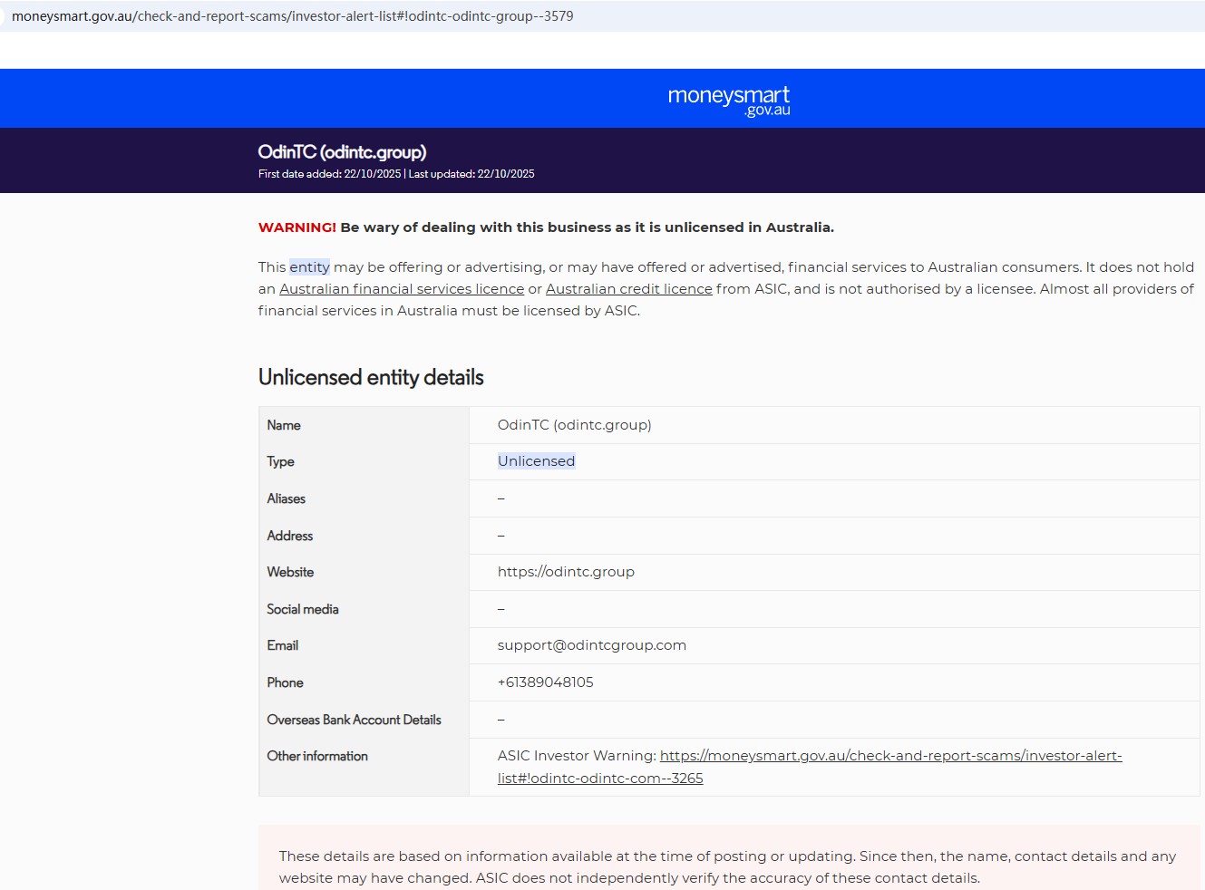 On Oct 22, 2025, the Australian Securities & Investments Commission (ASIC) issued a warning against OdinTC, believing this company might be providing financial services or products without proper authorization. https://moneysmart.gov.au/check-and-report-scams/investor-alert-list#!odintc-odintc-group--3579
