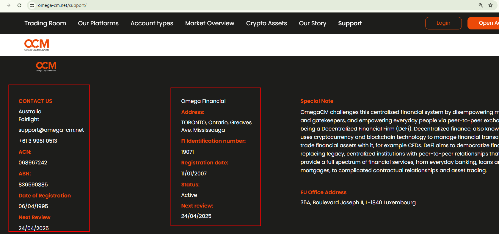 Omega Capital Markets displays registration information at the bottom of its homepage, claiming to be registered with relevant financial regulators in both Australia and Canada. However, the Australian Securities and Investments Commission (ASIC) has already issued a warning about Omega Capital Markets, identifying it as an imposter that misuses the information of the registered entity, OMEGA CAPITAL PTY LTD. As for its Canadian registration, there are no corresponding records from the Investment Industry Regulatory Organization of Canada (IIROC) to suggest its legitimacy and authenticity.