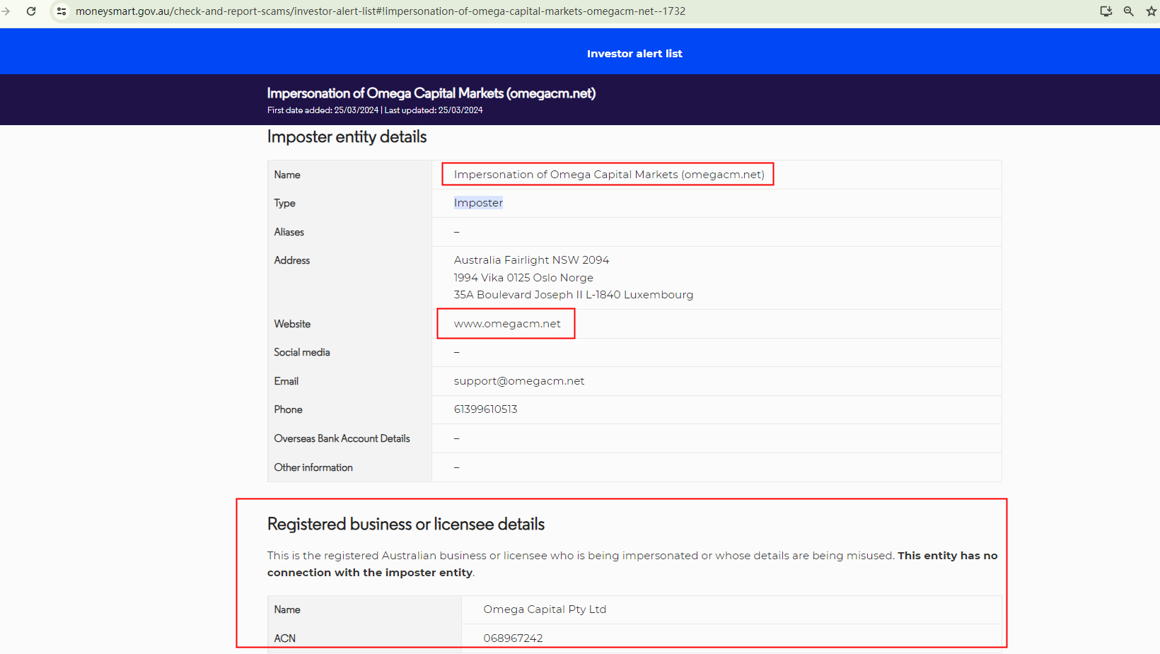 On March 25, 2024, the Australian Securities and Investments Commission (ASIC) flagged the website omegacm.net as an imposter. The operators of this site falsely refer to themselves as Omega Capital Markets. This fraudulent entity has misused the registration information of the legitimate firm, Omega Capital Pty Ltd. https://moneysmart.gov.au/check-and-report-scams/investor-alert-list#!impersonation-of-omega-capital-markets-omegacm-net--1732