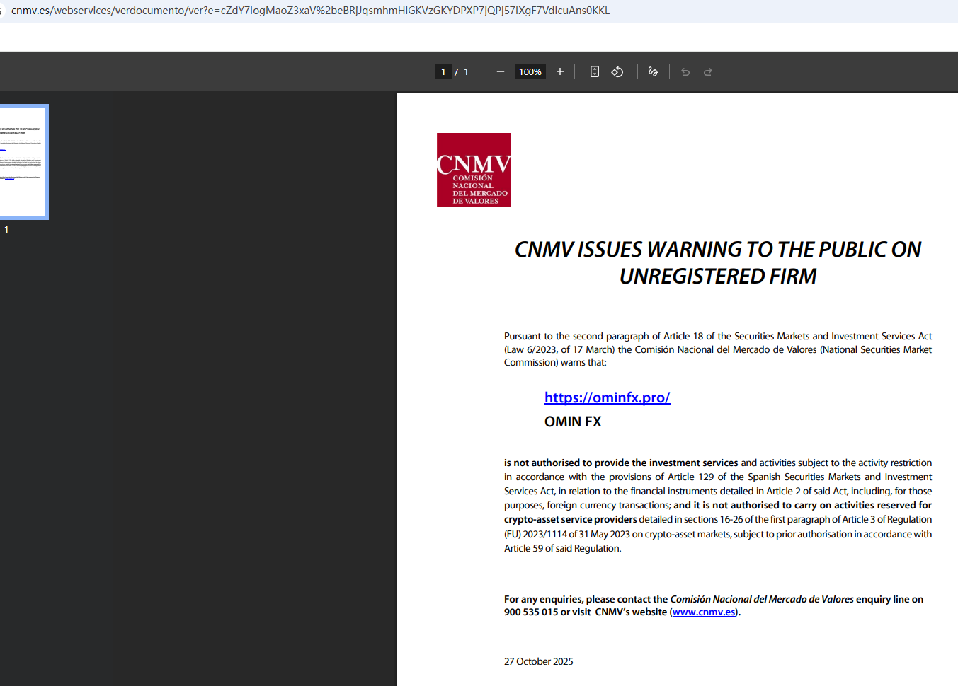 On Oct 27, 2025, the National Securities Market Commission (CNMV) issued a warning against OMIN FX, believing this company might be providing financial services or products without proper authorization. https://www.cnmv.es/webservices/verdocumento/ver?e=cZdY7IogMaoZ3xaV%2beBRjJqsmhmHlGKVzGKYDPXP7jQPj57IXgF7VdIcuAns0KKL