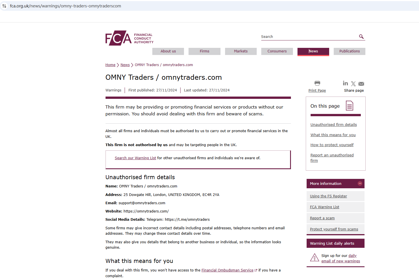 On November 27, 2024, the Financial Conduct Authority (FCA) issued a warning against OMNY Traders, believing this company might be providing financial services or products without proper authorization in the UK. https://www.fca.org.uk/news/warnings/omny-traders-omnytraderscom