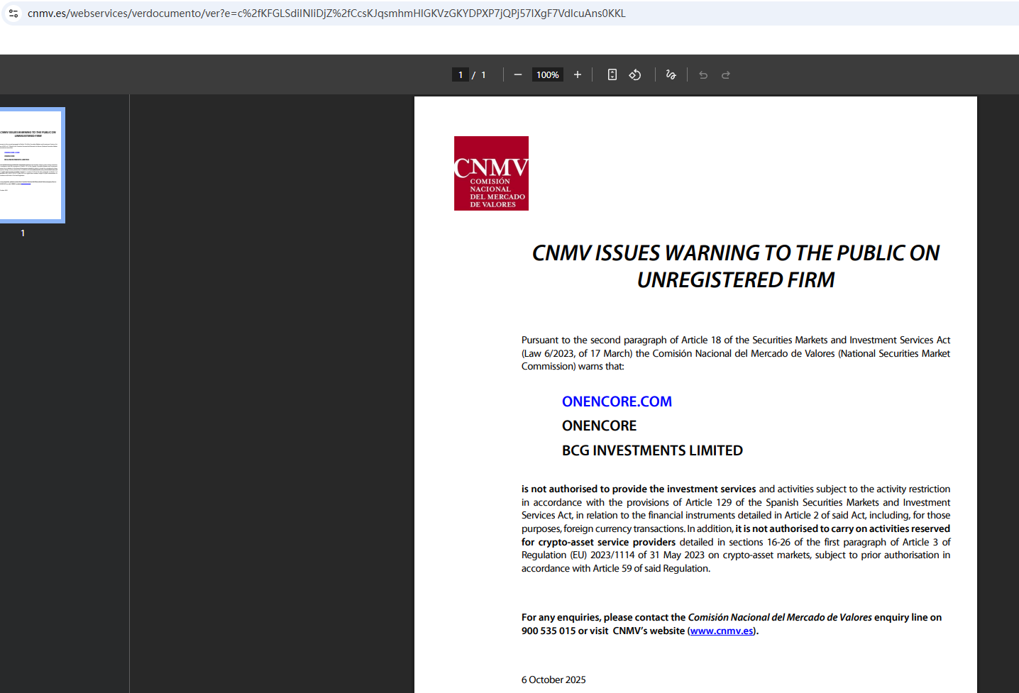 On Oct 6, 2025, the National Securities Market Commission (CNMV) issued a warning against ONENCORE, believing this company might be providing financial services or products without proper authorization. https://www.cnmv.es/webservices/verdocumento/ver?e=c%2fKFGLSdiINIiDjZ%2fCcsKJqsmhmHlGKVzGKYDPXP7jQPj57IXgF7VdIcuAns0KKL