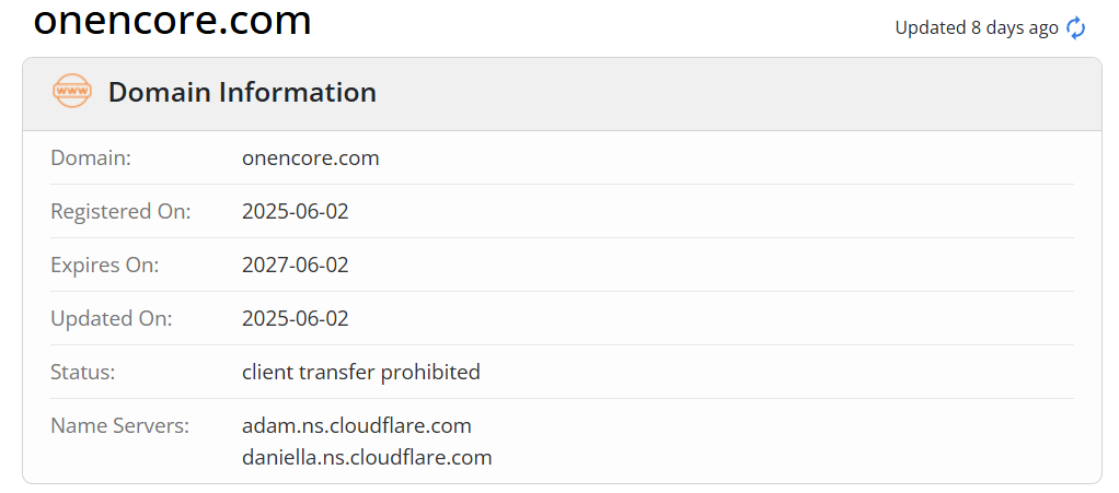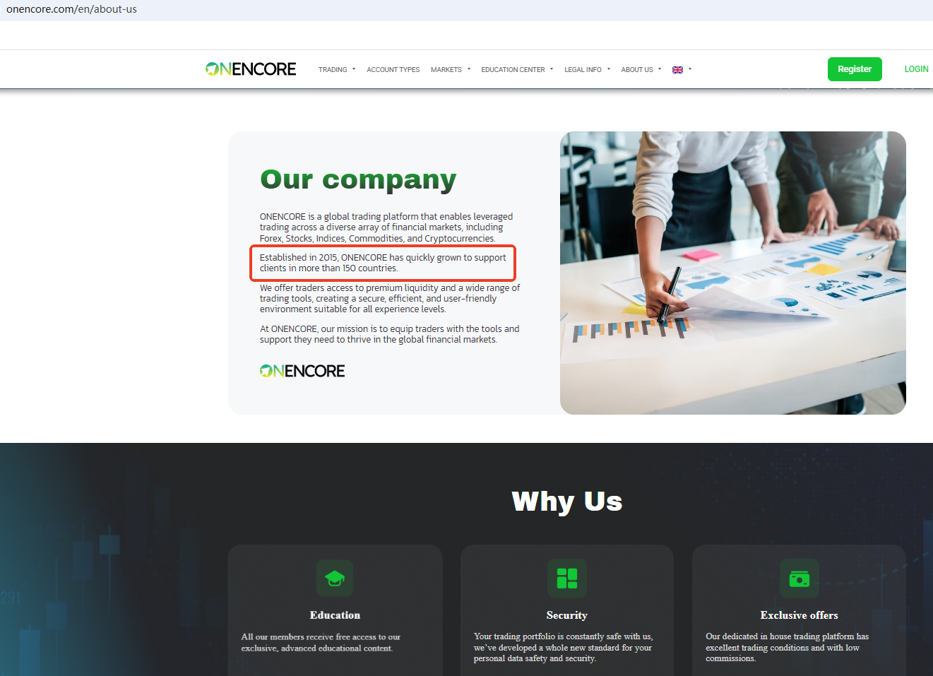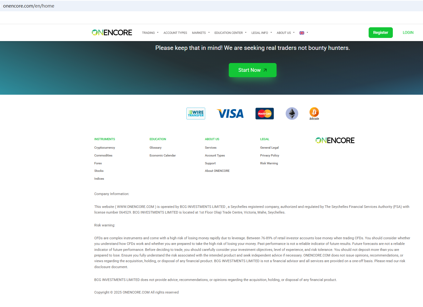According to its website, ONENCORE was established in 2015, is operated by BCG INVESTMENTS LIMITED, and is regulated by the Seychelles Financial Services Authority (FSA). Upon investigation, we discovered that its domain name was not established until 2025, which is clearly discrepant with the information on its website and the facts. Furthermore, we found no matching information with the Seychelles FSA. More notably, the National Securities Market Commission (CNMV) issued a warning against ONENCORE, believing this company might be providing financial services or products without proper authorization.