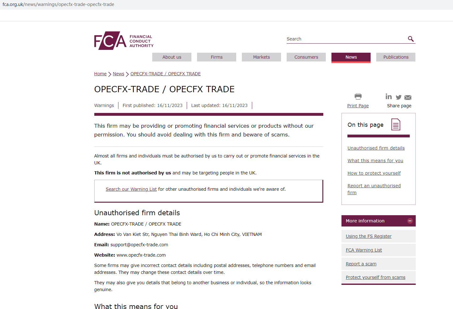 In addition, the United Kingdom Financial Conduct Authority (UK FCA) issued a warning that OPECFX TRADE was providing financial services or products without authorisation.