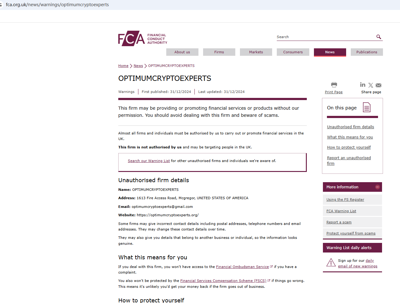 On December 31, 2024, the Financial Conduct Authority (FCA) issued a warning against OPTIMUMCRYPTOEXPERTS, believing this company might be providing financial services or products without proper authorization in the UK. https://www.fca.org.uk/news/warnings/optimumcryptoexperts