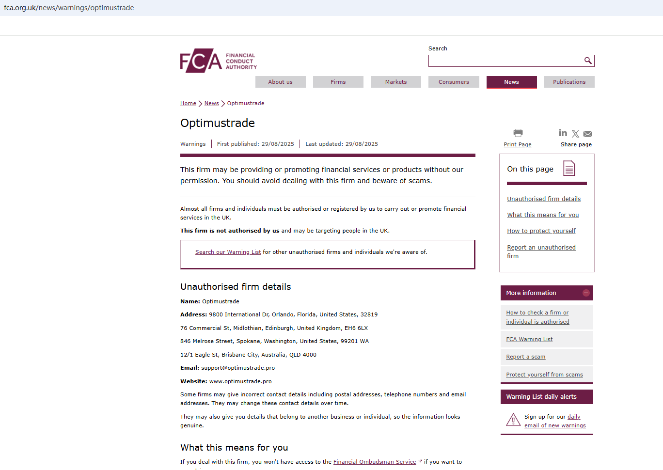 On Aug 29, 2025, the Financial Conduct Authority (FCA) issued a warning against Optimustrade, believing this company might be providing financial services or products without proper authorization. https://www.fca.org.uk/news/warnings/optimustrade