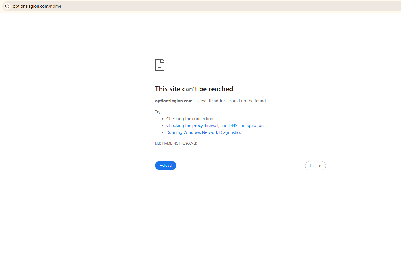 BrokersView found that the domain "https://optionslegion.com/home" is currently inaccessible. This is widely regarded as a significant red flag, as the suspension of a broker's website often points to underlying regulatory or operational issues.