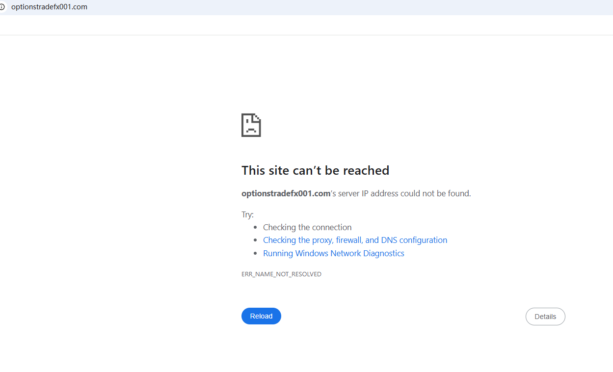 BrokersView found that the domain "https://optionstradefx001.com/" is currently inaccessible. This is widely regarded as a significant red flag, as the suspension of a broker's website often points to underlying regulatory or operational issues.