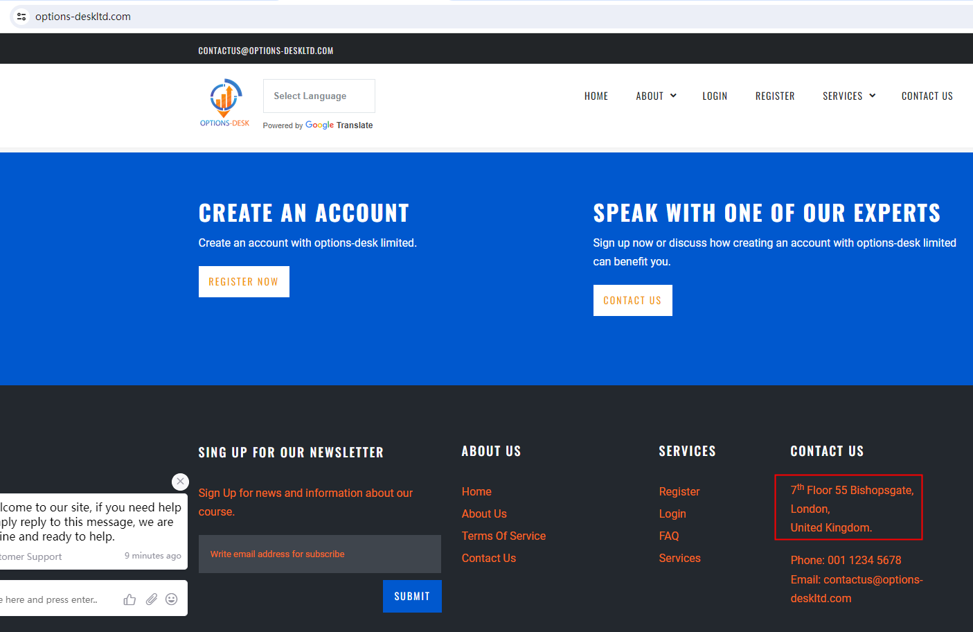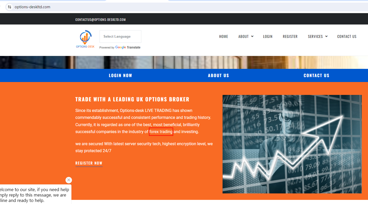 The website options-deskltd.com claims to be a reliable company without presenting any information about its regulation.