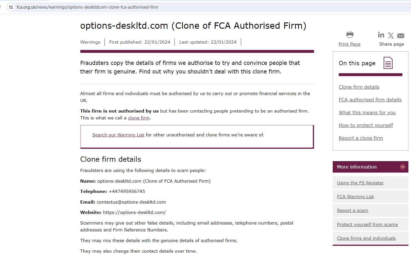 On 22 January 2024, the United Kingdom Financial Conduct Authority (UK FCA) issued a warning that the website, options-deskltd.com, was a clone of an FCA-authorized firm. You may visit: https://www.fca.org.uk/news/warnings/options-deskltdcom-clone-fca-authorised-firm