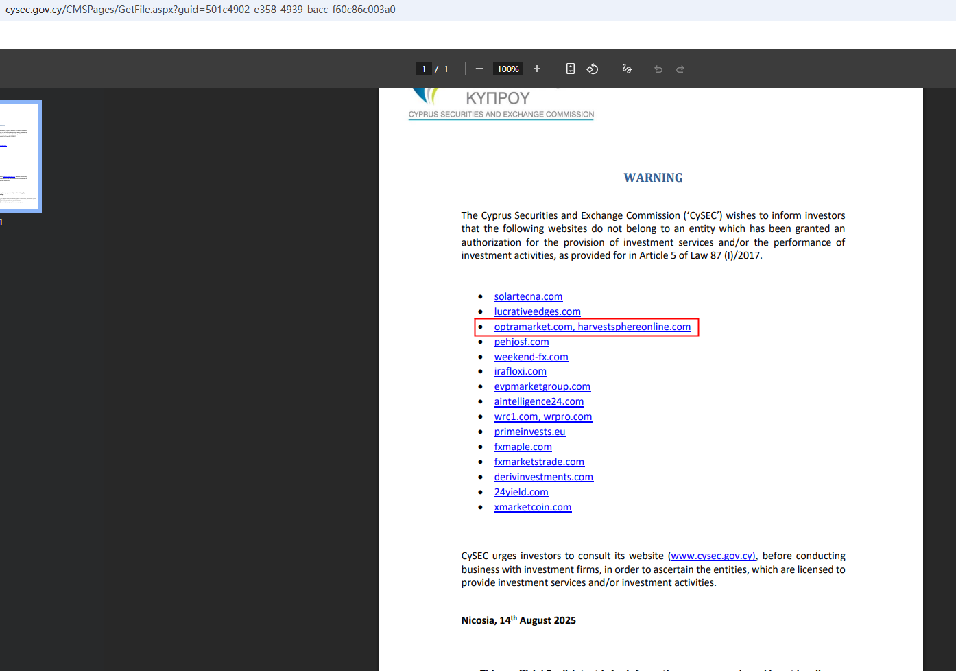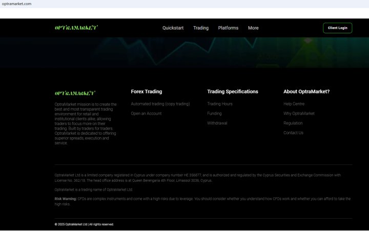 On Aug 14, 2025, the Cyprus Securities and Exchange Commission (CySEC) issued a warning against OptraMarket, believing this company might be providing financial services or products without authorisation. You may visit: https://www.cysec.gov.cy/CMSPages/GetFile.aspx?guid=501c4902-e358-4939-bacc-f60c86c003a0