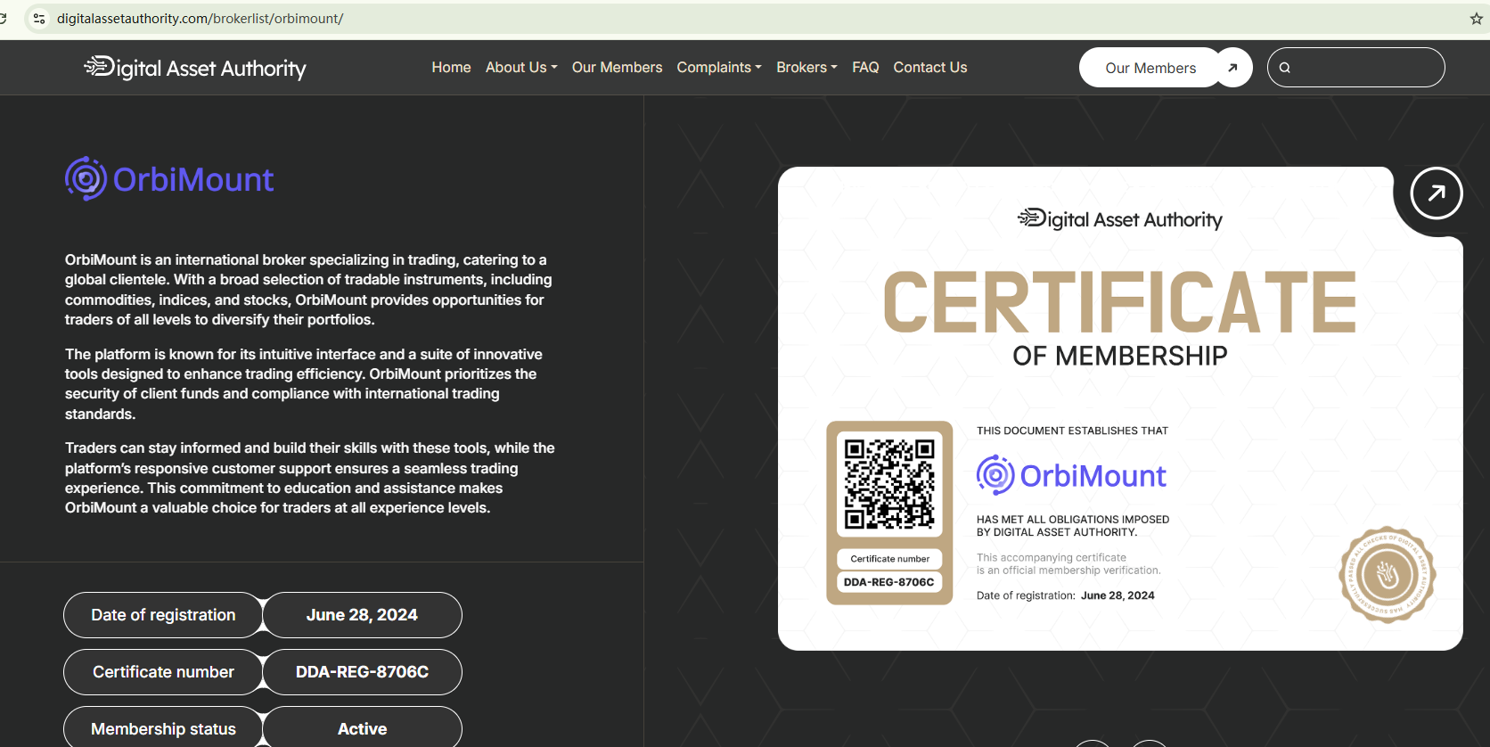 Orbimount only relies on a certificate claimed to be authorized by the Digital Asset Authority, which doesn't seem to exist, to mislead unsuspecting investors into believing their authenticity. The practice is fraud. Additionally, the Italian Companies and Exchange Commission (CONSOB) ordered Orbimount to be blacked out since it offers financial services illegally in Italy.