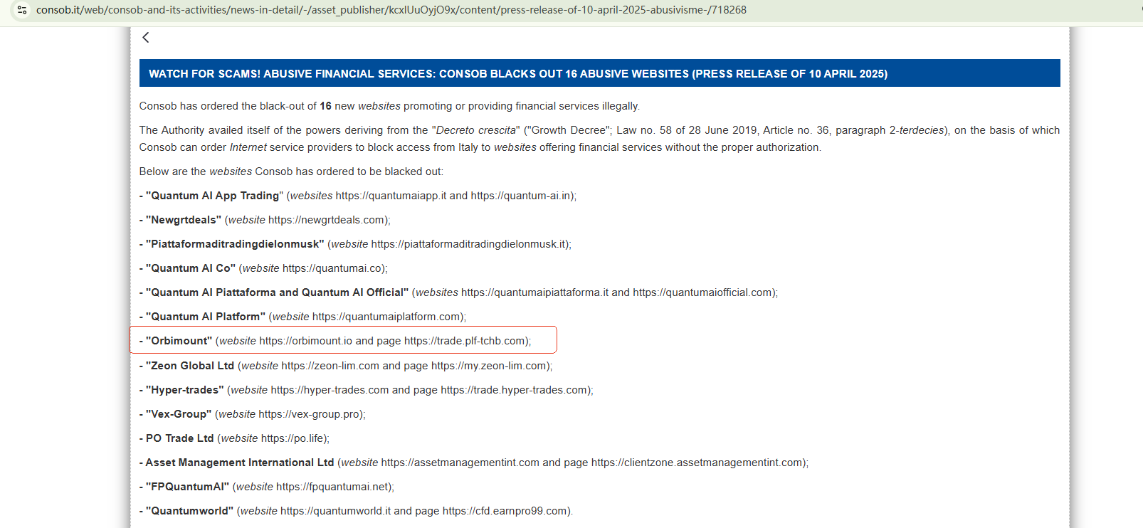 On April 10, 2025, the Italian Companies and Exchange Commission (CONSOB) ordered Orbimount to be blacked out since it offers financial services illegally in Italy. https://www.consob.it/web/consob-and-its-activities/news-in-detail/-/asset_publisher/kcxlUuOyjO9x/content/press-release-of-10-april-2025-abusivisme-/718268