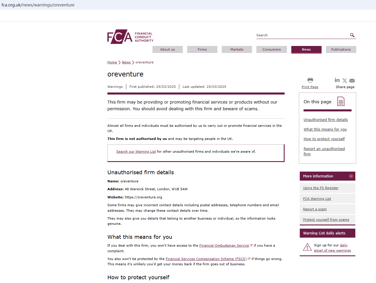 On March 25, 2025, the Financial Conduct Authority (FCA) issued a warning against oreventure for the lack of the required authorization. https://www.fca.org.uk/news/warnings/oreventure