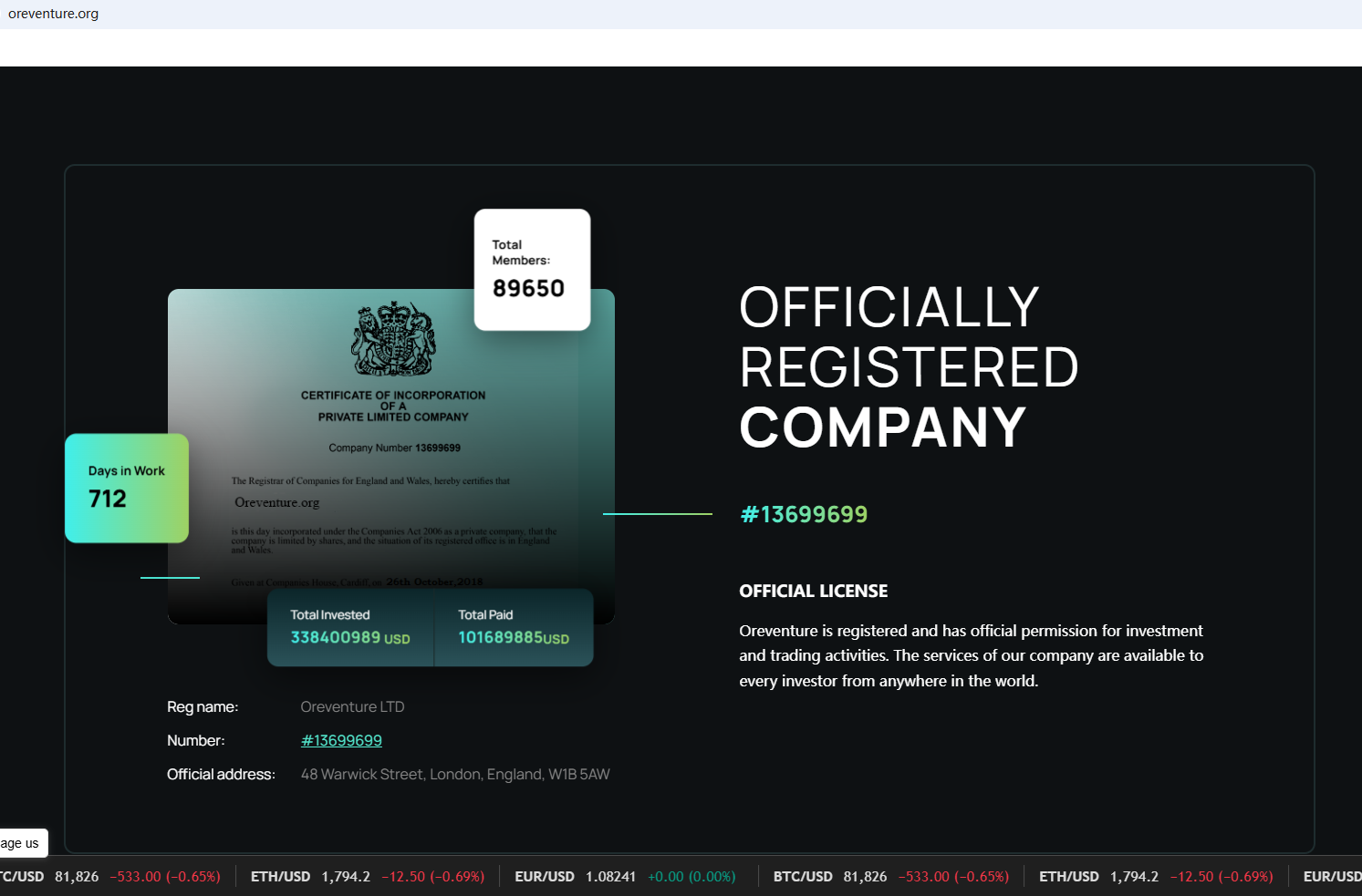 The website uses a common template for scammers and has been flagged by Brokersview many times before, for example: Option Bull Market. It displays a certificate from Companies House (CH) on the website, but as we all know, CH does not have the authority to regulate foreign exchange. The funny thing is that the Financial Conduct Authority (FCA) issued a warning against oreventure for the lack of the required authorization.