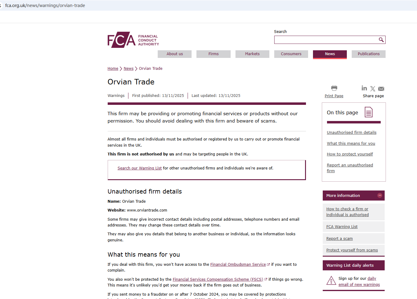 On Nov 13, 2025, the Financial Conduct Authority (FCA) issued a warning regarding Orvian Trade, suspecting that this company may be offering financial services or products without the necessary authorization. https://www.fca.org.uk/news/warnings/orvian-trade