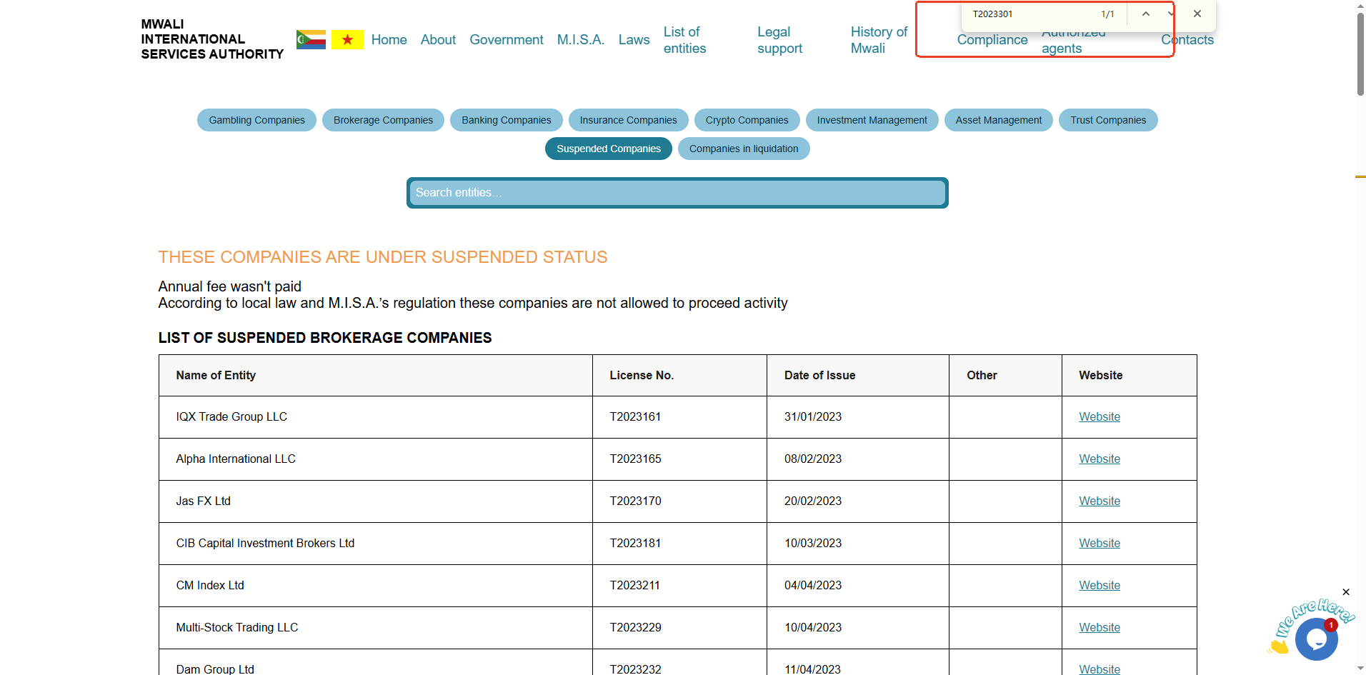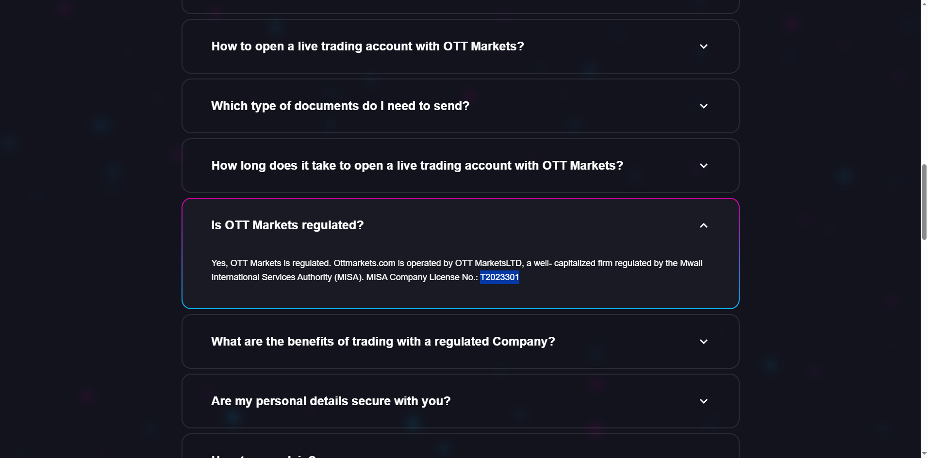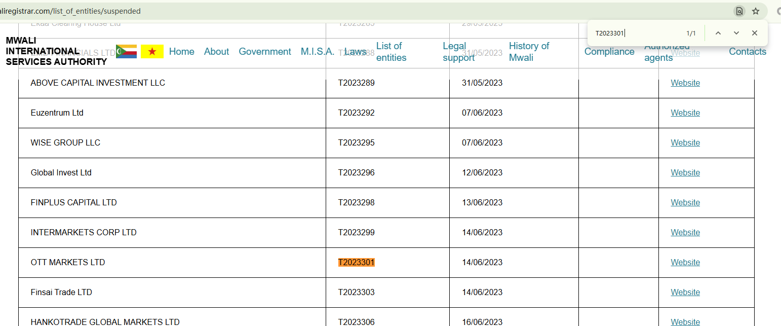 OTT Markets claims to be regulated by the MWALI International Services Authority (MISA) and provides license number T2023301. However, this license has been suspended, and the company is no longer allowed to conduct trading activities. Besides, MISA is considered an offshore regulator with limited international credibility and oversight, even prior to its suspension, OTT Markets was not subject to rigorous supervision, increasing the risk of engaging in questionable trading practices. Given these concerns, OTT Markets appears to be a scam.