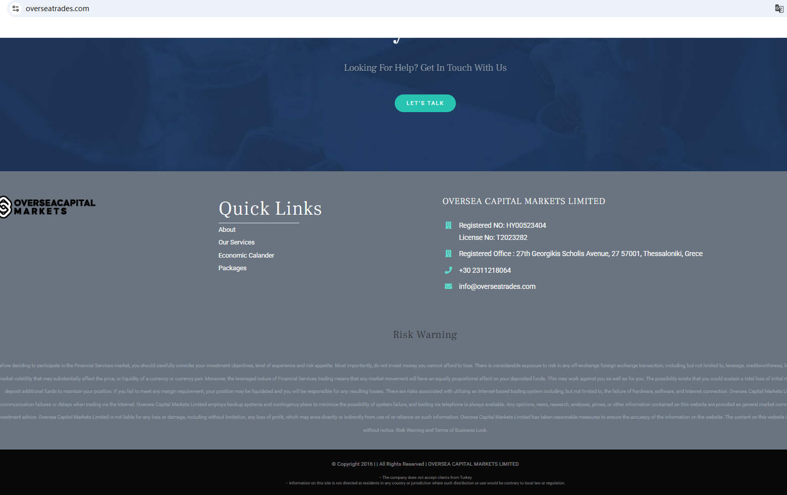 According to its website, it claims to be registered with MWALI INTERNATIONAL SERVICES AUTHORITY (MISA). Upon investigation, no matching information was found in the MISA. In essence, Oversea Capital Markets Limited is not regulated by any governing body. Entrusting it with investors' funds is highly risky, as there are no legal protections in place to safeguard the funds. Oversea Capital Markets Limited appears to be a scam.