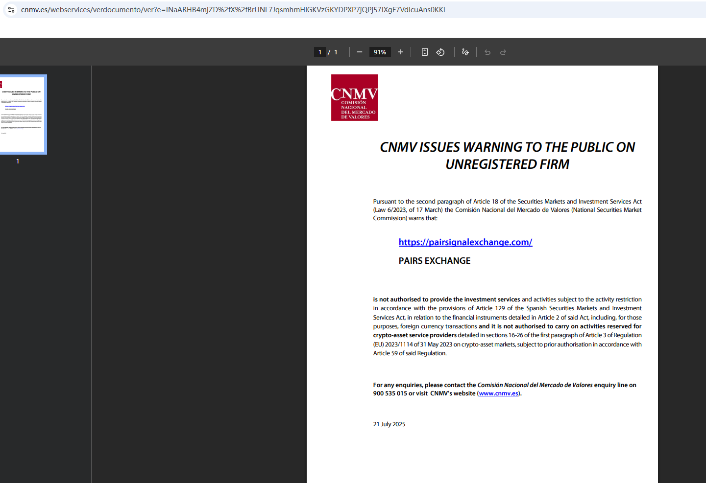 On July 21, 2025, the National Securities Market Commission (CNMV) issued a warning against PAIRS EXCHANGE, believing this company might be providing financial services or products without proper authorization. https://www.cnmv.es/webservices/verdocumento/ver?e=INaARHB4mjZD%2fX%2fBrUNL7JqsmhmHlGKVzGKYDPXP7jQPj57IXgF7VdIcuAns0KKL