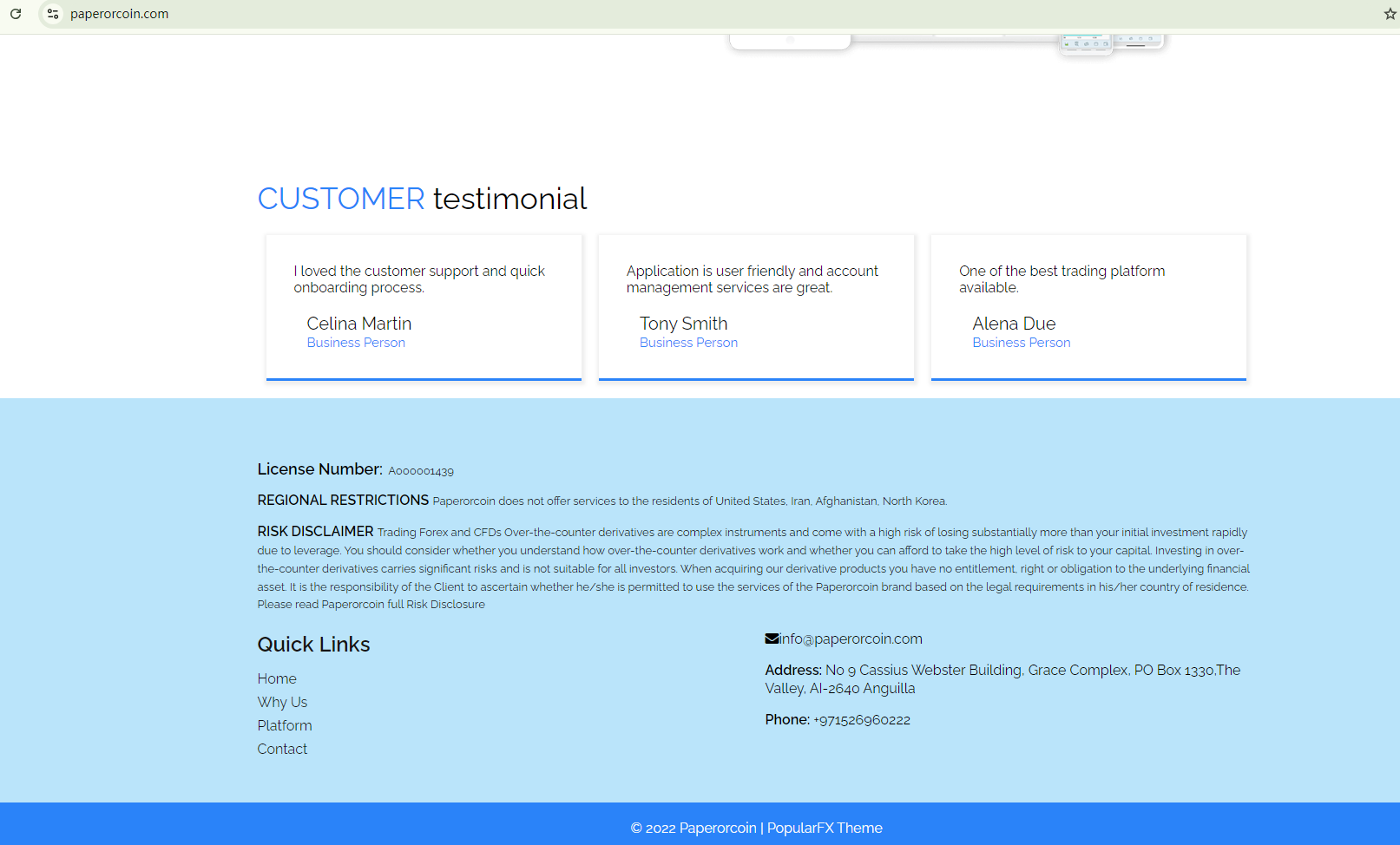 It is important to note that Paperorcoin claims to be based in Anguilla, where forex trading activities are not regulated by the local financial authority.